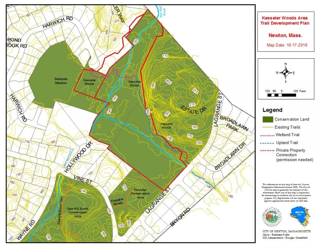 One of the last large, privately owned pieces of open space in Newton, Kesseler Woods was threatened with development in 2003. At the urging of the Newton Conservators and other open space advocates, the City of Newton was successful in protecting a majority of this property through an innovative partnership with a private developer, Cornerstone Corporation.