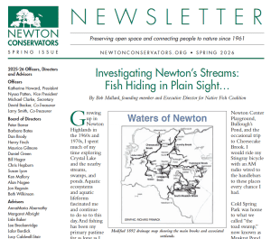 2026 Spring Newsletter Full Issue (PDF) Individual Articles Investigating Newtons Streams:Fish Hiding in Plain Sight Upper Falls Greenway and Riverwalk Improvements New Edition of the Trail Guide Annual Meeting 2026 New Insect Pest: Spotted Lanternfly is in Newton Spring 2026 Walks Enjoy Nature…with webinars from Newton Conservators Enjoy Nature….wth webinars from Newton Conservators Spring 2026 Invasive Plant Sessions