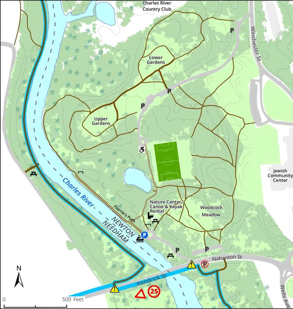 Accessible Trails, Biking, Birding, Boat Launch, Canoe & Kayak Rental, Charles River Walk, Cross Country Skiing, Farm or Garden, Historic Site, Meadow, Picnic Tables, Pond, Sports Fields, Toilet Facilities, Vernal Pool, Woods Trail