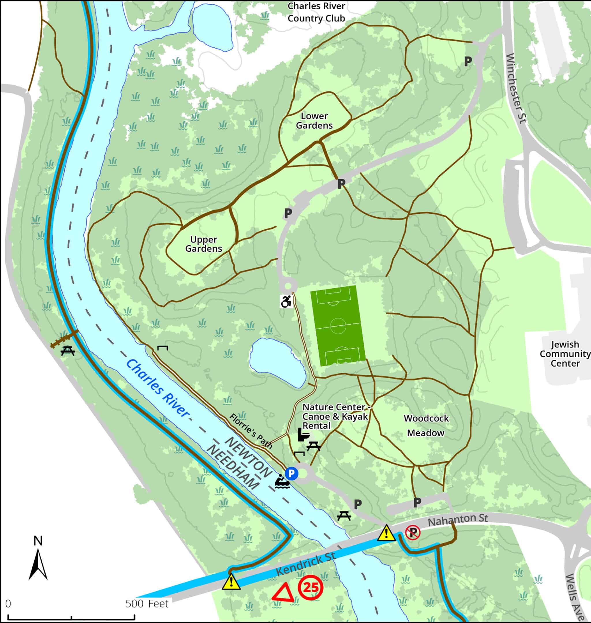 Accessible Trails, Biking, Birding, Boat Launch, Canoe & Kayak Rental, Charles River Walk, Cross Country Skiing, Farm or Garden, Historic Site, Meadow, Picnic Tables, Pond, Sports Fields, Toilet Facilities, Vernal Pool, Woods Trail