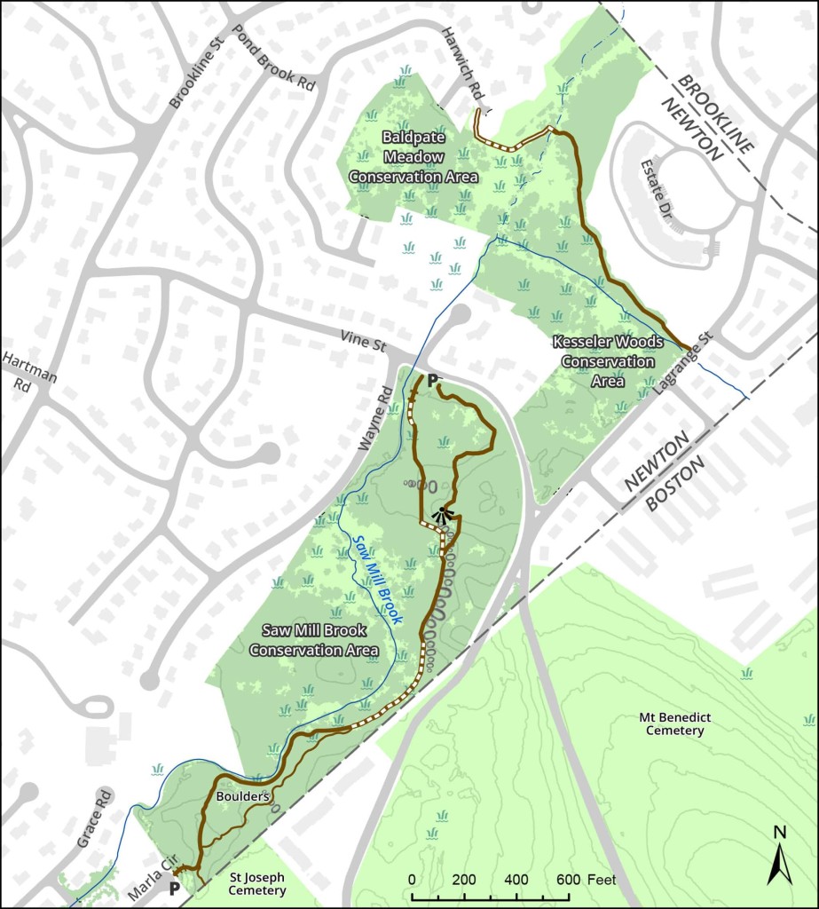 Area connects to a much larger green corridor running through West Roxbury and South Newton. Near the Marla Circle end of the trail, you can walk into St. Joseph Cemetery and from there, cross Baker Street to Brook Farm Historic Site. Beyond Brook Farm is the Blue Heron Trail along the Charles. More about the long walk