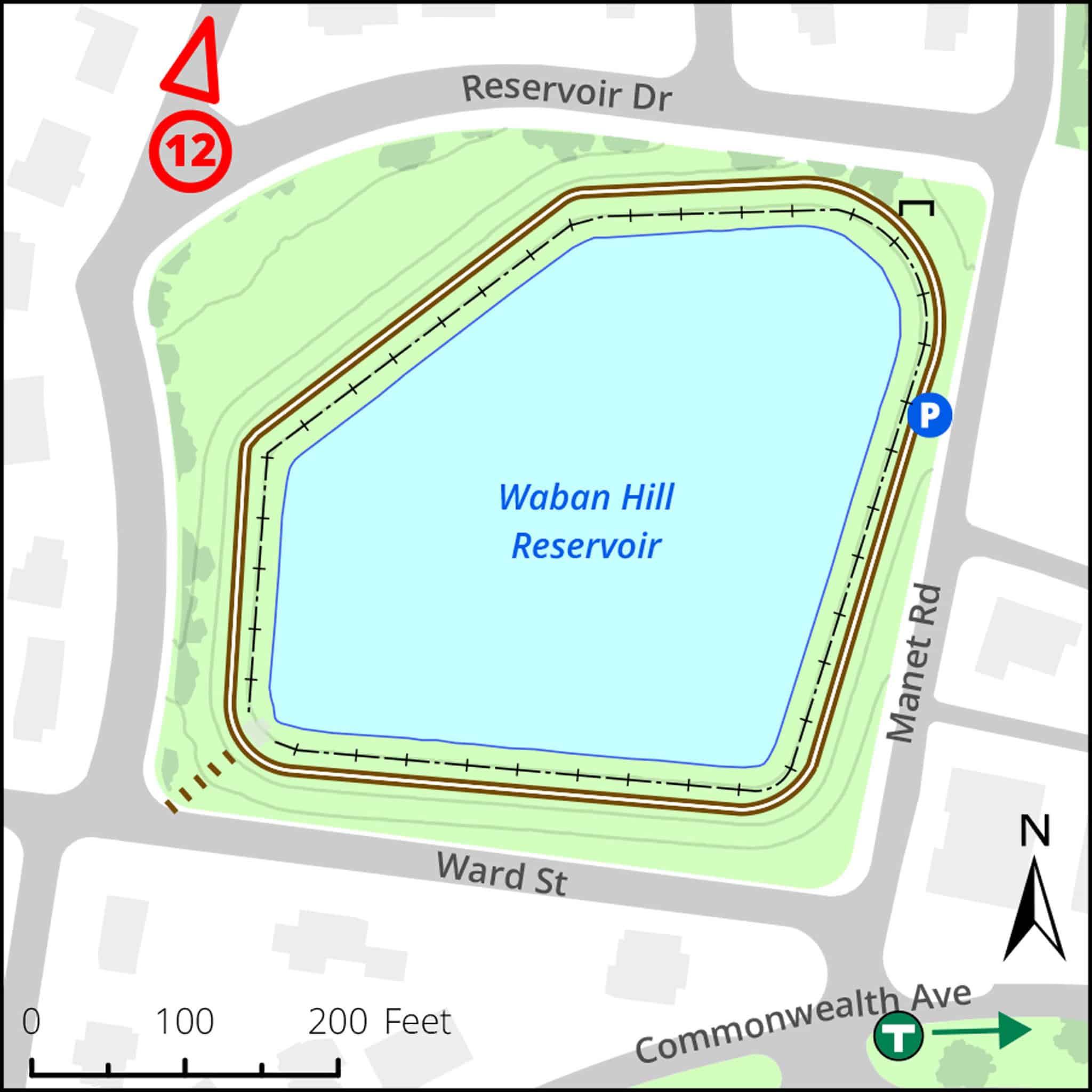 The former MWRA “Waban Hill Reservoir” is located on a hill overlooking Boston College (and not in the Waban neighborhood). Newton acquired the property in 2015 and turned it into a park which includes an accessible trail around the perimeter of the reservoir, as well as a small grass playing area.