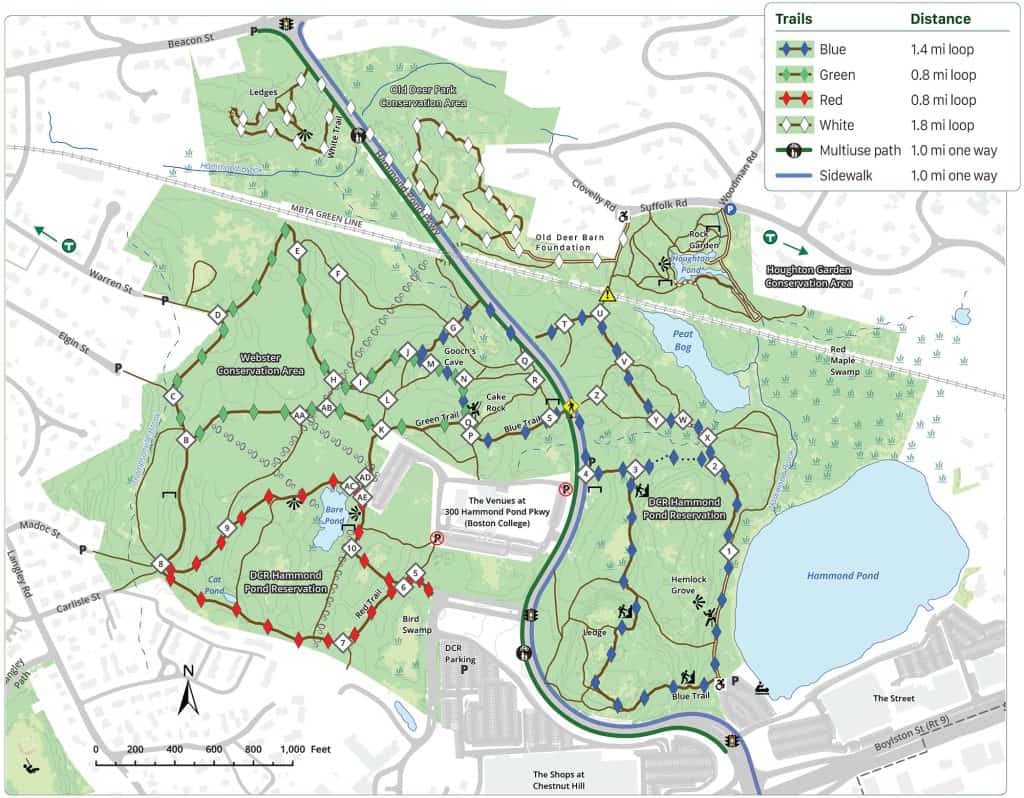 Hammond Woods and Pond – The trails and cliffs attract hikers and rock climbers. The pond, as a “great pond” (any pond larger that 10 acres) is state-owned, operated by the DCR. Its average depth is just four feet. Access is from the gravel beach on the west side of the pond, near the parking lot of The Street at Chestnut Hill shopping center. The pond and its adjoining marshes and woodlands provide valuable habitats for a diversity of wildlife, aquatic species, and native plants.