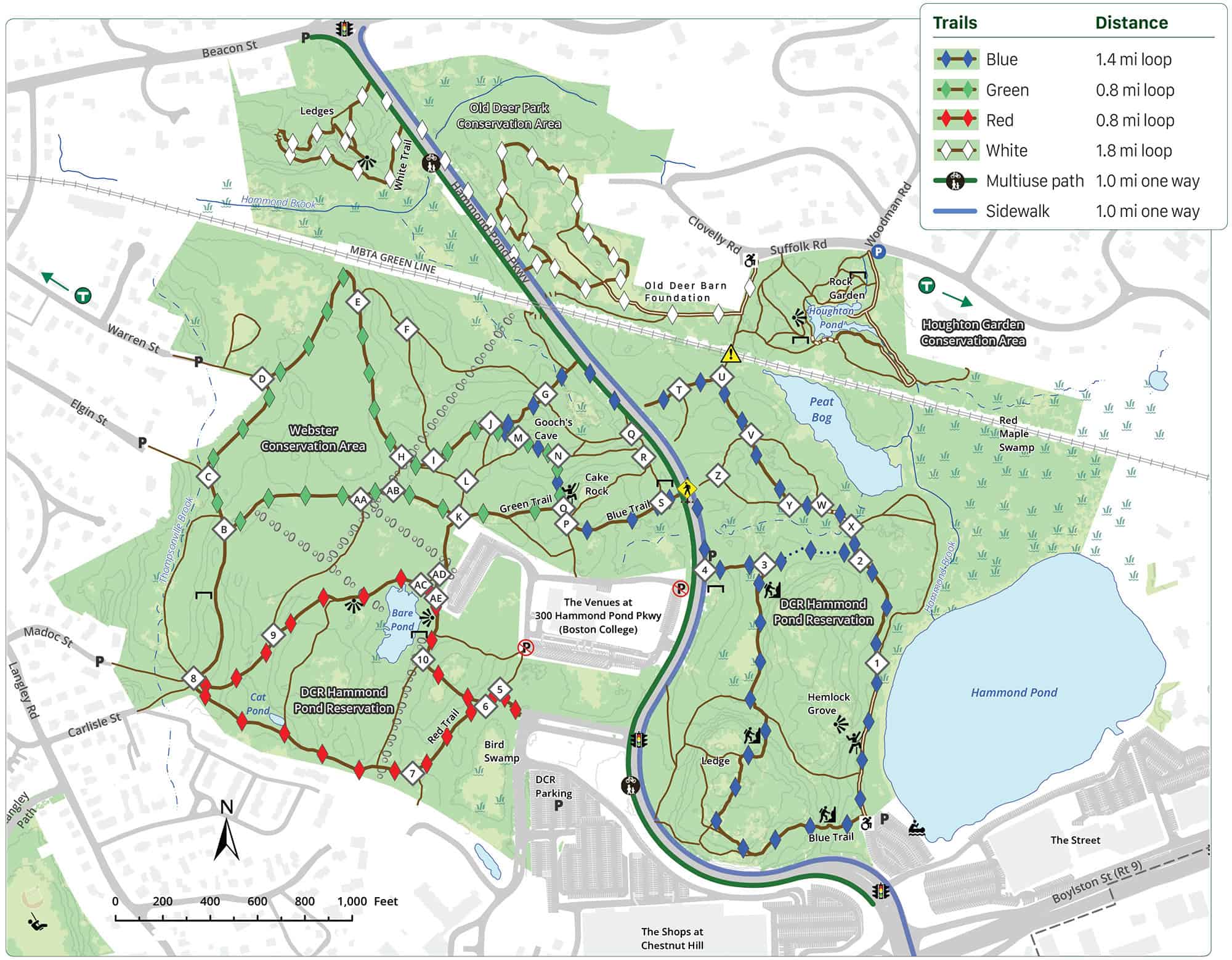 Accessible Trails, Birding, Boat Launch, Conservation Area, Cross Country Skiing, Farm or Garden, Geologic Features, Historic Site, MBTA Green Line, Meadow, Pond, Rock Climbing, Scenic View, Vernal Pool, Woods Trail